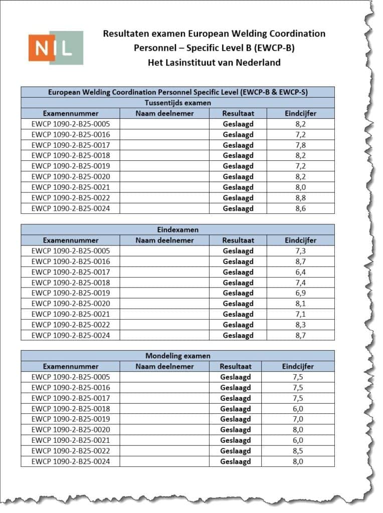 Deze week ontvingen wij vanuit het Nederlands Instituut voor Lastechniek de resultaten van de afgelopen lichting EWCP-B. Onderstaand een overzicht van de prachtige cijfers. Wij feliciteren alle deelnemers met deze topprestatie, en wensen hen heel veel succes in hun nieuwe rol als lascoรถrdinator๐Ÿ‘ทโ€โ™‚๏ธ